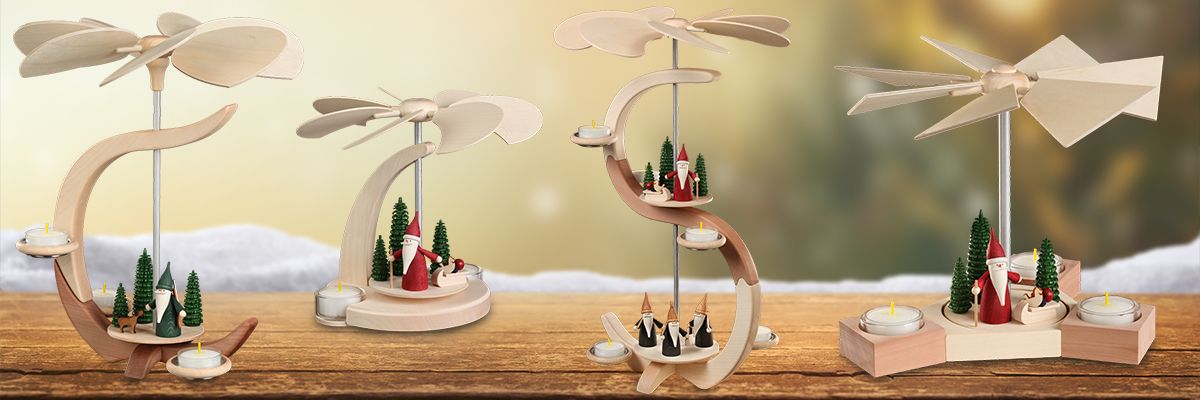 Das ist das geniale Prinzip der erzgebirgischen Weihnachtspyramide: Die Wärme der Kerzen oder Teelichte steigt nach oben, trifft auf die schräg stehenden Flügel, das gelagerte Mittelteil wird bewegt. Der drehbare Mittelteil besteht aus dem Stab, einer oder mehrerer Scheiben und dem Flügelrad mit mehreren Flügeln. Die Scheiben, auch Stufen oder Etagen der Pyramide, tragen die Bestückung, geschnitzte oder gedrechselte Figuren, Tiere, Szenen. Dieser drehbare Mittelteil ist in das Gestell, der Basiskonstruktion der Pyramide, integriert.